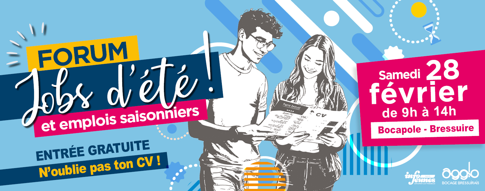Afin d’accompagner les jeunes dans leur recherche d’un emploi pendant la saison estivale, l’Agglomération du Bocage Bressuirais, via son service jeunesse, organise le « Forum Jobs d’été et emplois saisonniers » à Bocapole - Bressuire. Cet évènement gratuit, réunis chaque année une trentaine de partenaires, publics ou privés.