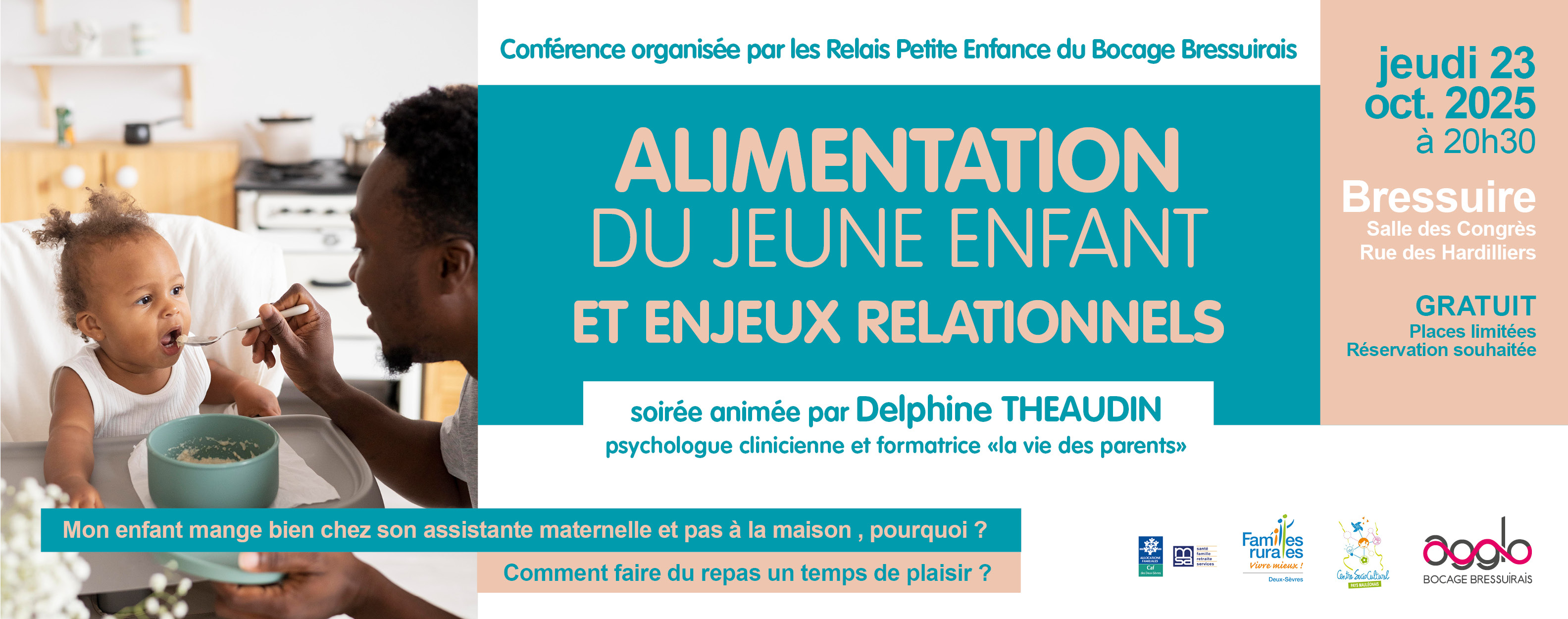 Pour mieux comprendre ces situations et retrouver le plaisir du repas partagé, les Relais Petite Enfance du Bocage Bressuirais proposent une soirée-conférence intitulée « Alimentation du jeune enfant et enjeux relationnels », animée par Delphine THEAUDIN, psychologue clinicienne et formatrice au sein de La Vie des Parents.